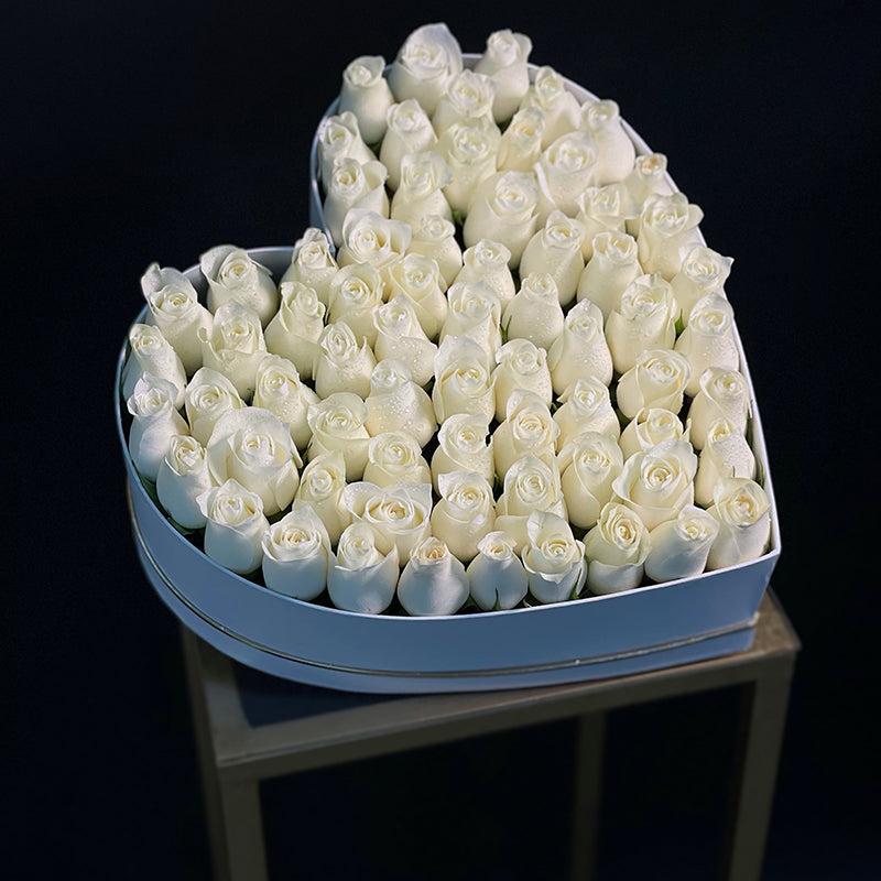 This exquisite heart-shaped box of Pure White roses (any color possible) offers a timeless appeal, perfect for expressing your deepest affections. Hand-picked and freshly cut for your special someone, each rose is guaranteed to bring warmth and joy.